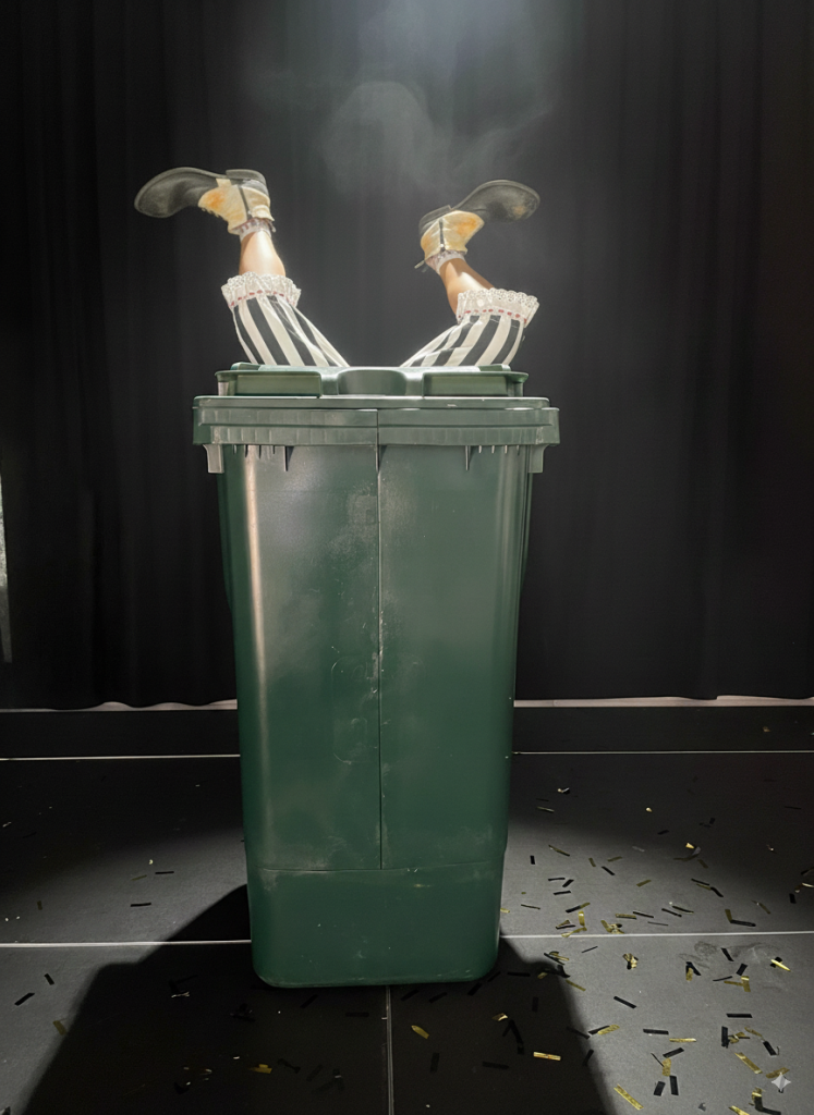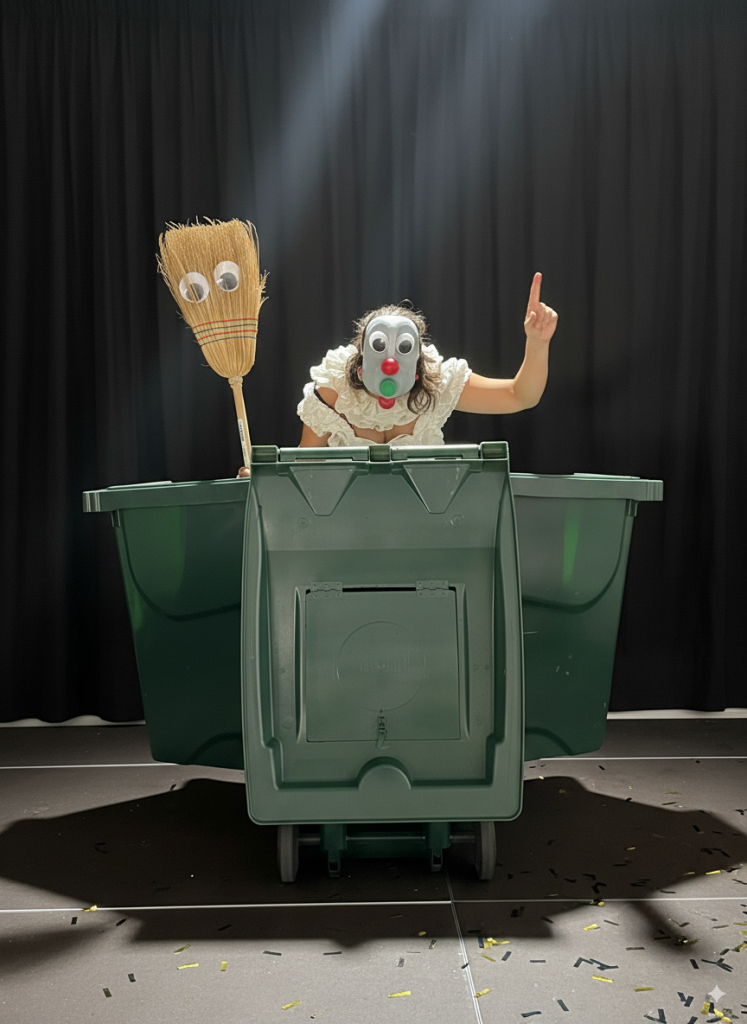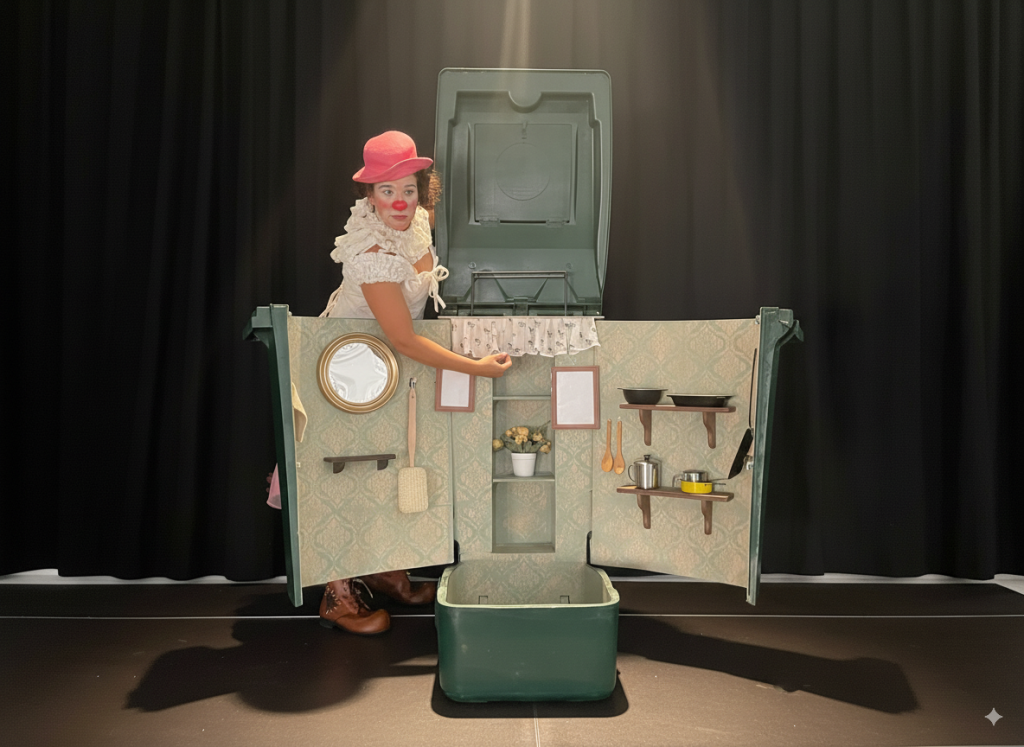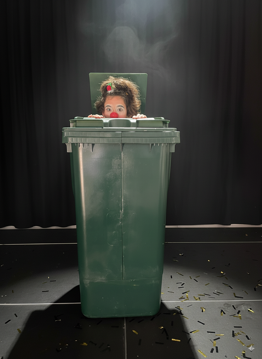 Una payasa ha sido detenida por ser libre, honesta y auténtica. Su sola presencia amenaza el orden establecido, así que es encerrada. Pero ella no se rinde: se escapa, se esconde en un cubo de basura que transforma en refugio y fantasía, y